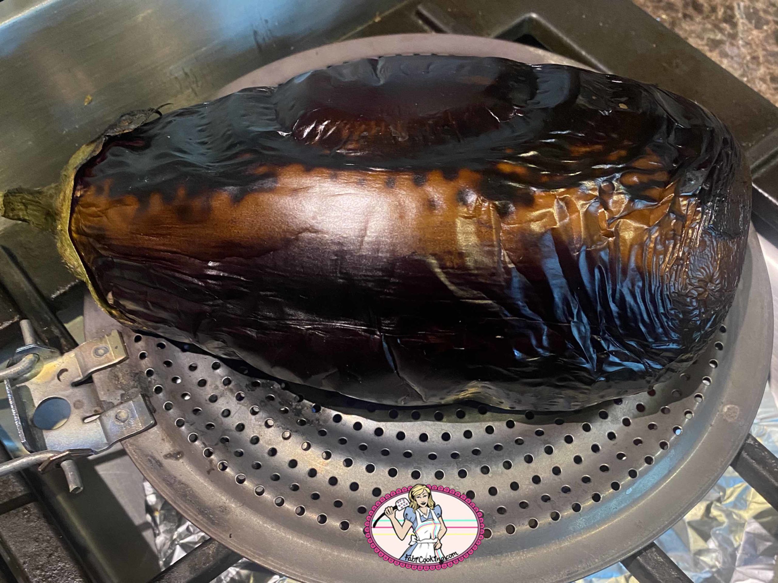 2. Faire griller l’aubergine au four, au barbecue ou comme moi, tout simplement sur le bec à gaz. Quand elle devient bien molle, la retirer de sur le feu.