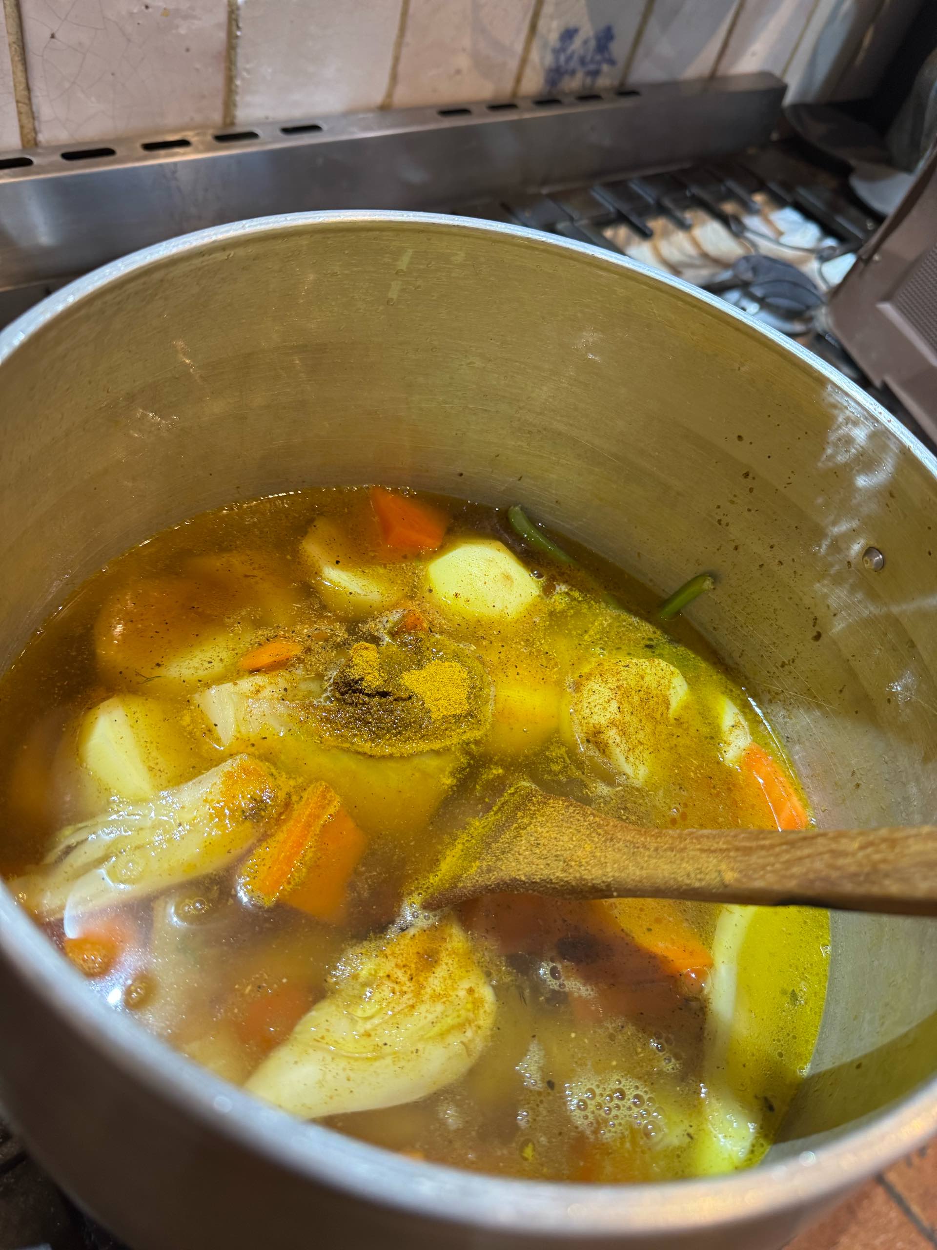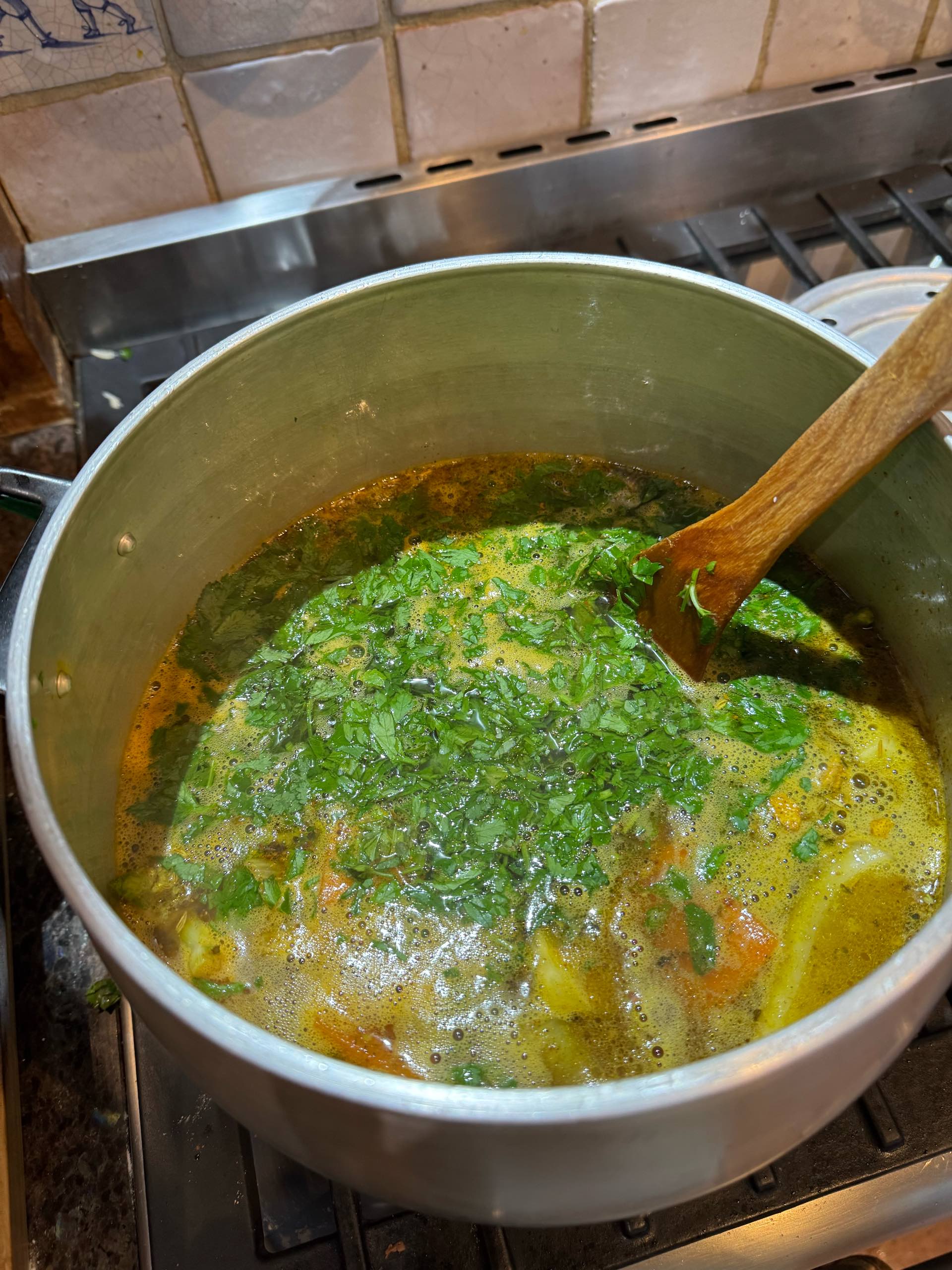 6. Ensuite, verser le bouillon de légumes ( maison, c’est meilleur mais deux cubes de » bouillon méditerranéen » feront l’affaire avec deux feuilles de laurier et quelques brins de persil) et cuire pendant 20mn à feu moyen. Ciseler la coriandre fraiche et la joindre aux bouillon avec les filaments de safran et deux cuillers à café de ras el hanout. Rectifier l’assaisonnement en sel et poivre si nécessaire.