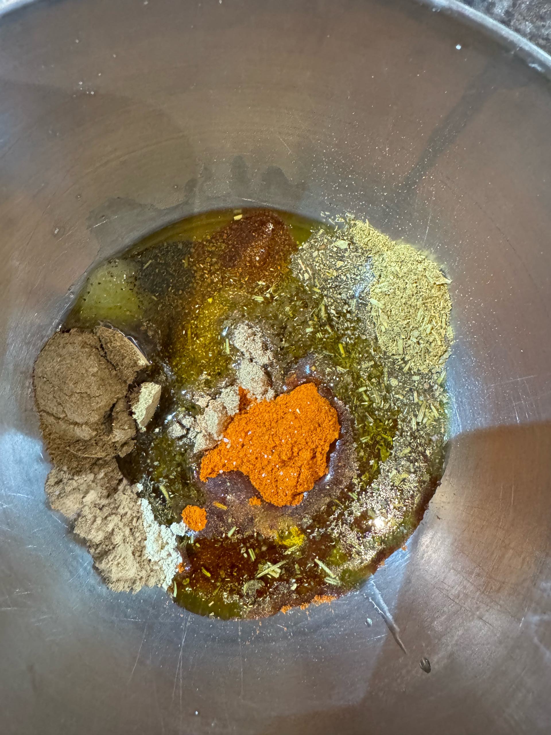 - Préparer toutes les épices et les faire torréfier quelques minutes avant de les mélanger avec les deux cuillers d’huile d’olive. Râper sur le tout 2 gousses d’ail.