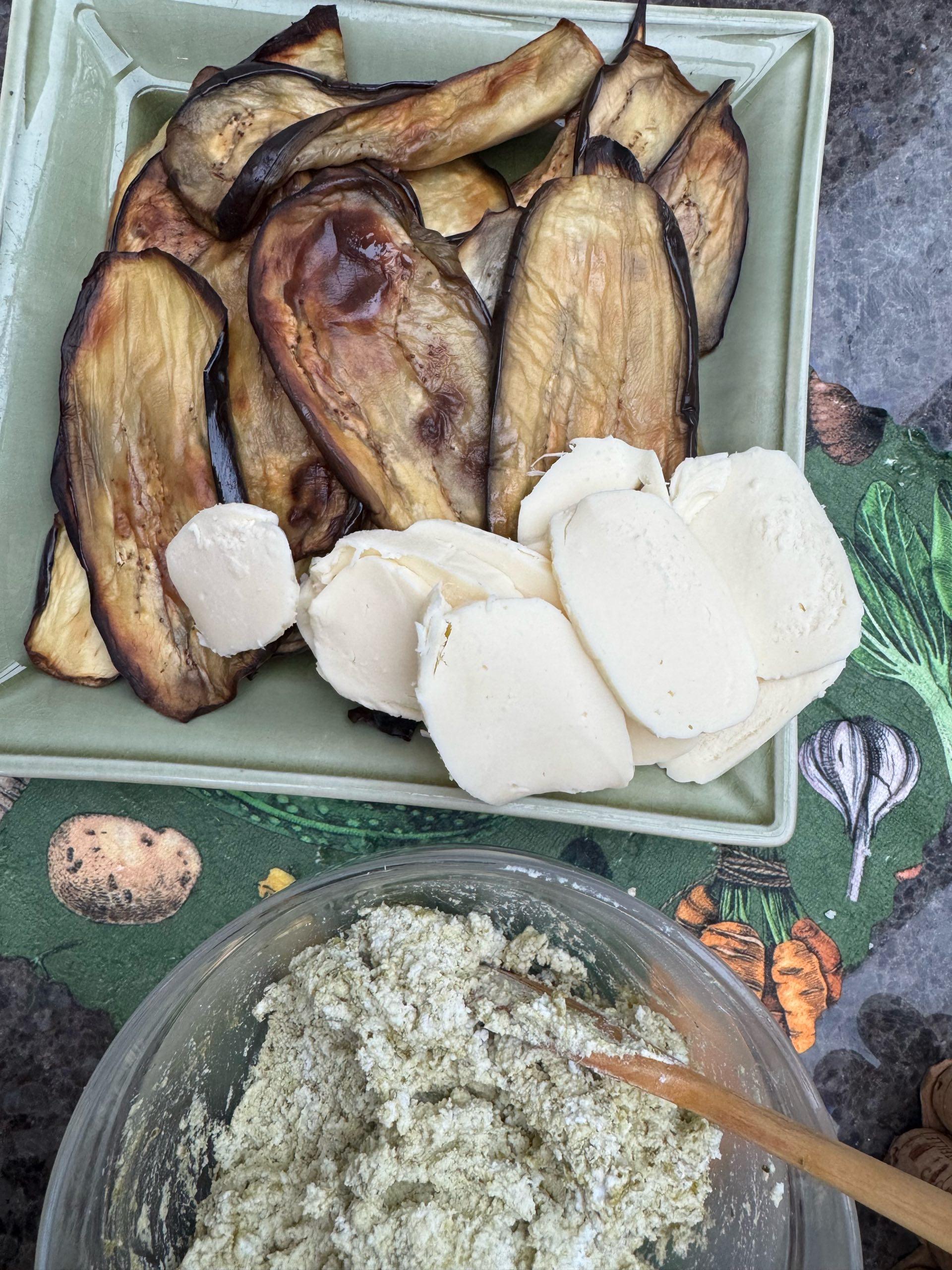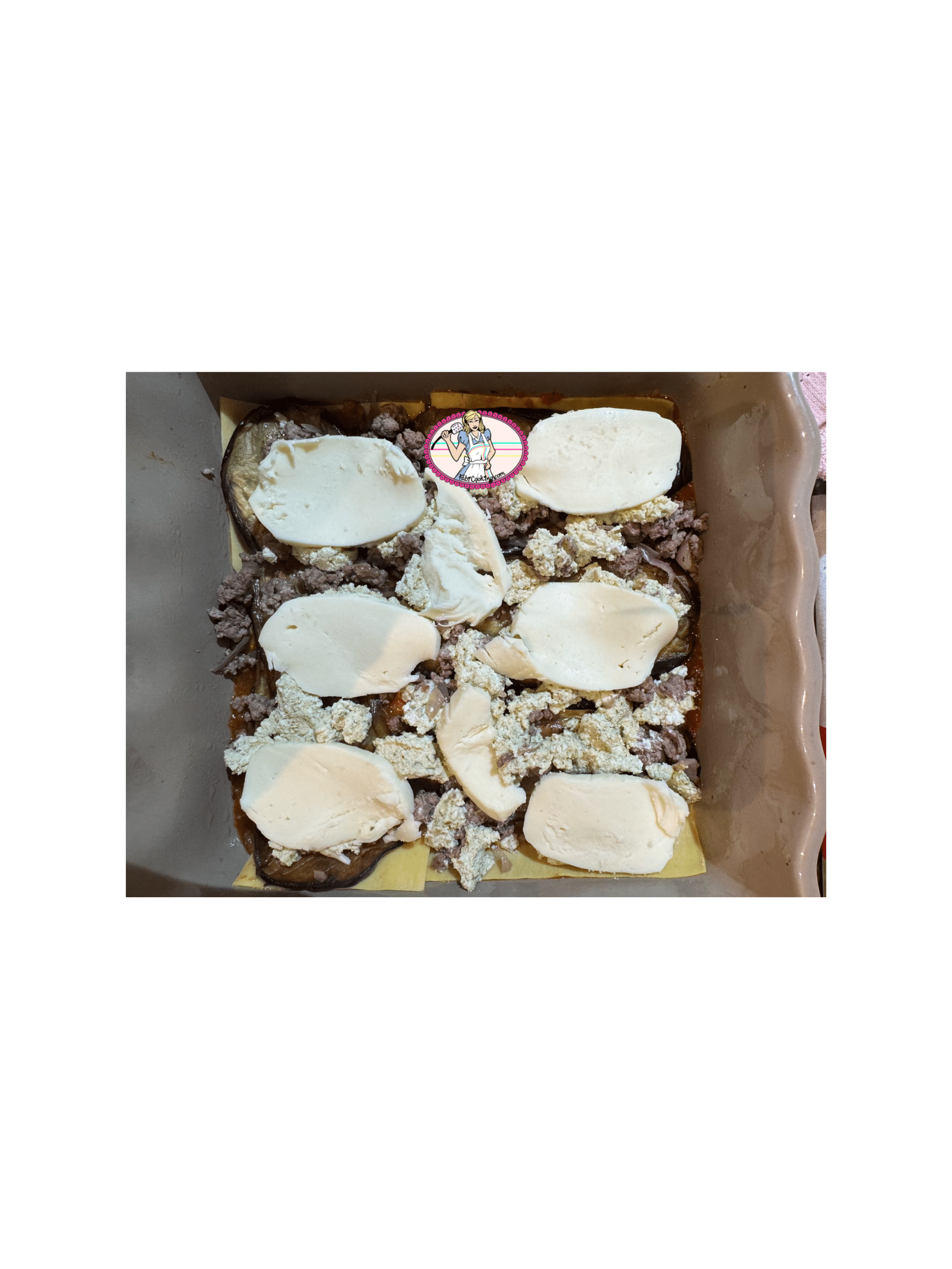 - A la cuiller, placer des petits tas de ricotta ( pas simple de la tartiner uniformément) sur les aubergines et la viande puis garnir de mozzarella.
