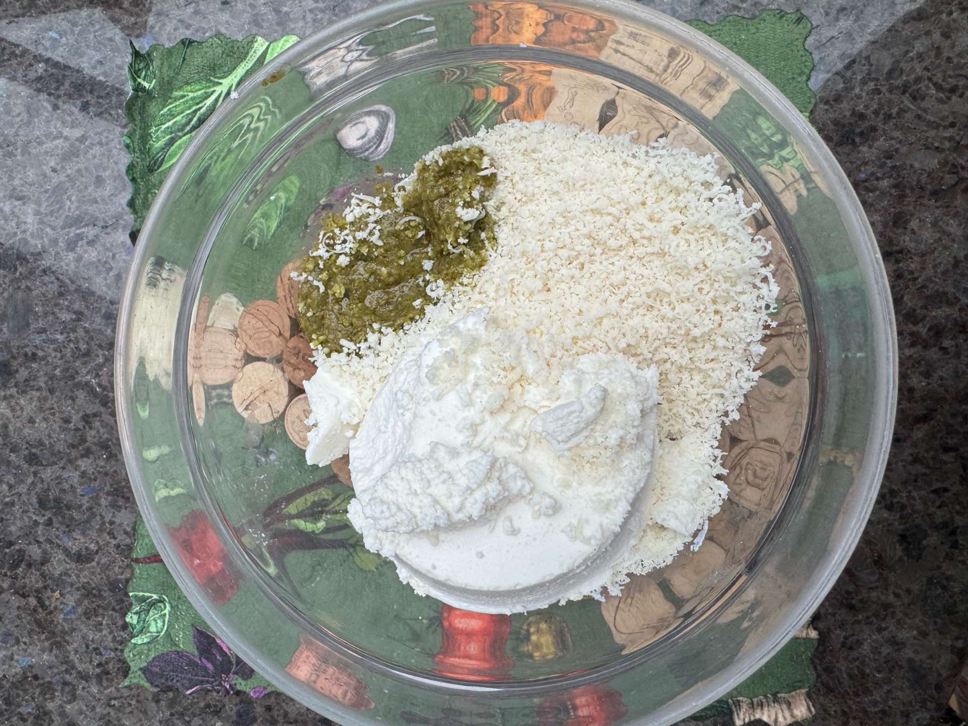- Dans un bol, mélanger ricotta, pistou et le 30 g de parmesan râpé. Goûter et rajouter un peu de poivre et quelques feuilles de basilic frais ciselé.