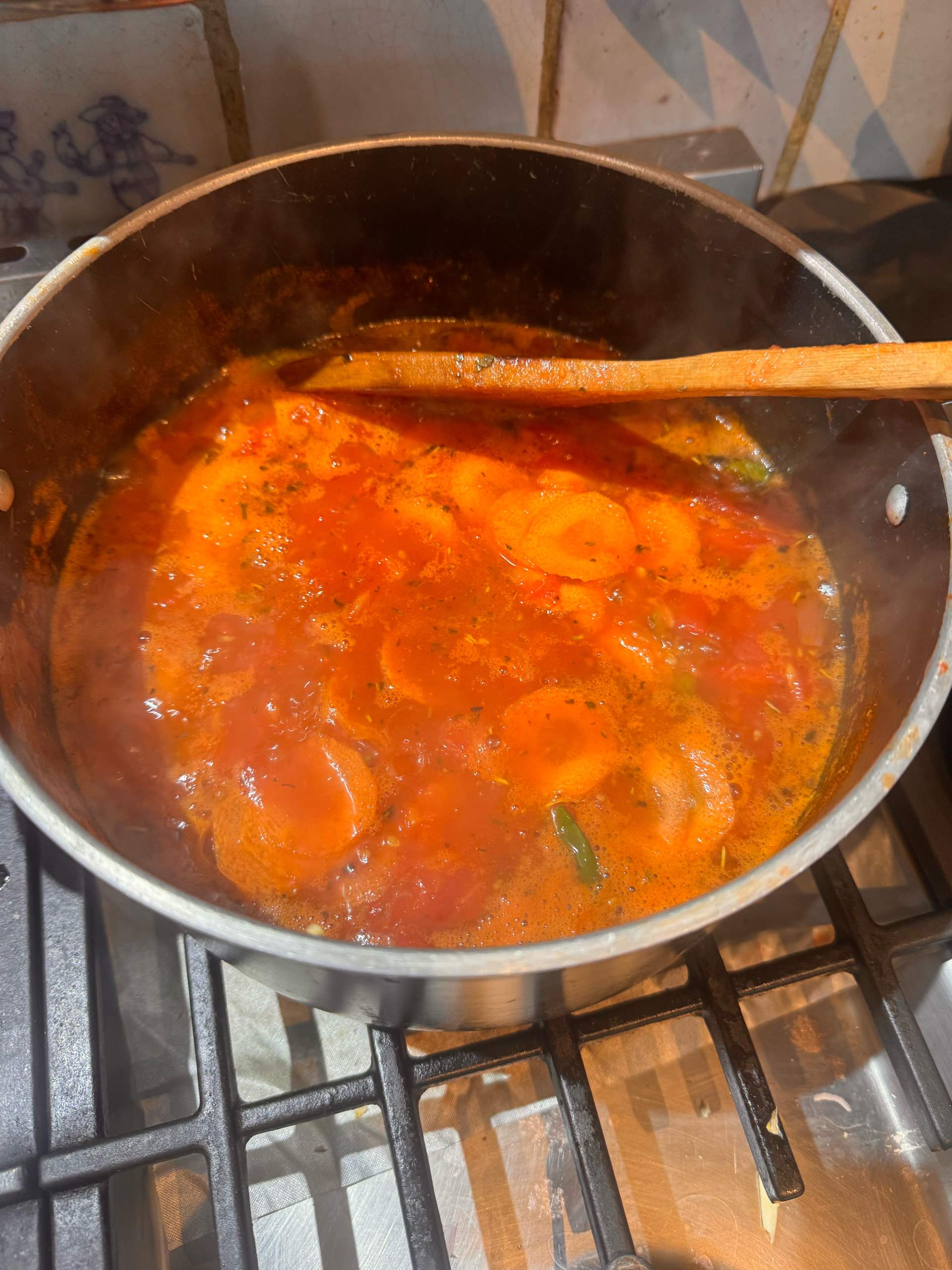 - Verser la passata ou les tomates pelées concassées en boîte.