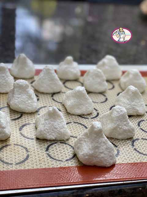 7. Garder un petit bol d’eau à proximité. En ce qui me concerne, je me suis servie d’une cuiller pour doser des boules de pâte que j’ai roulées dans la paume de mes mains très légèrement humidifiées ( cela ne collera pas) puis formées en leur donnant une forme de petite pyramide avec mes doigts eux aussi, un peu humides. Vous pouvez déposer tout simplement, à la cuillère, des petits tas sur le tapis de cuisson.