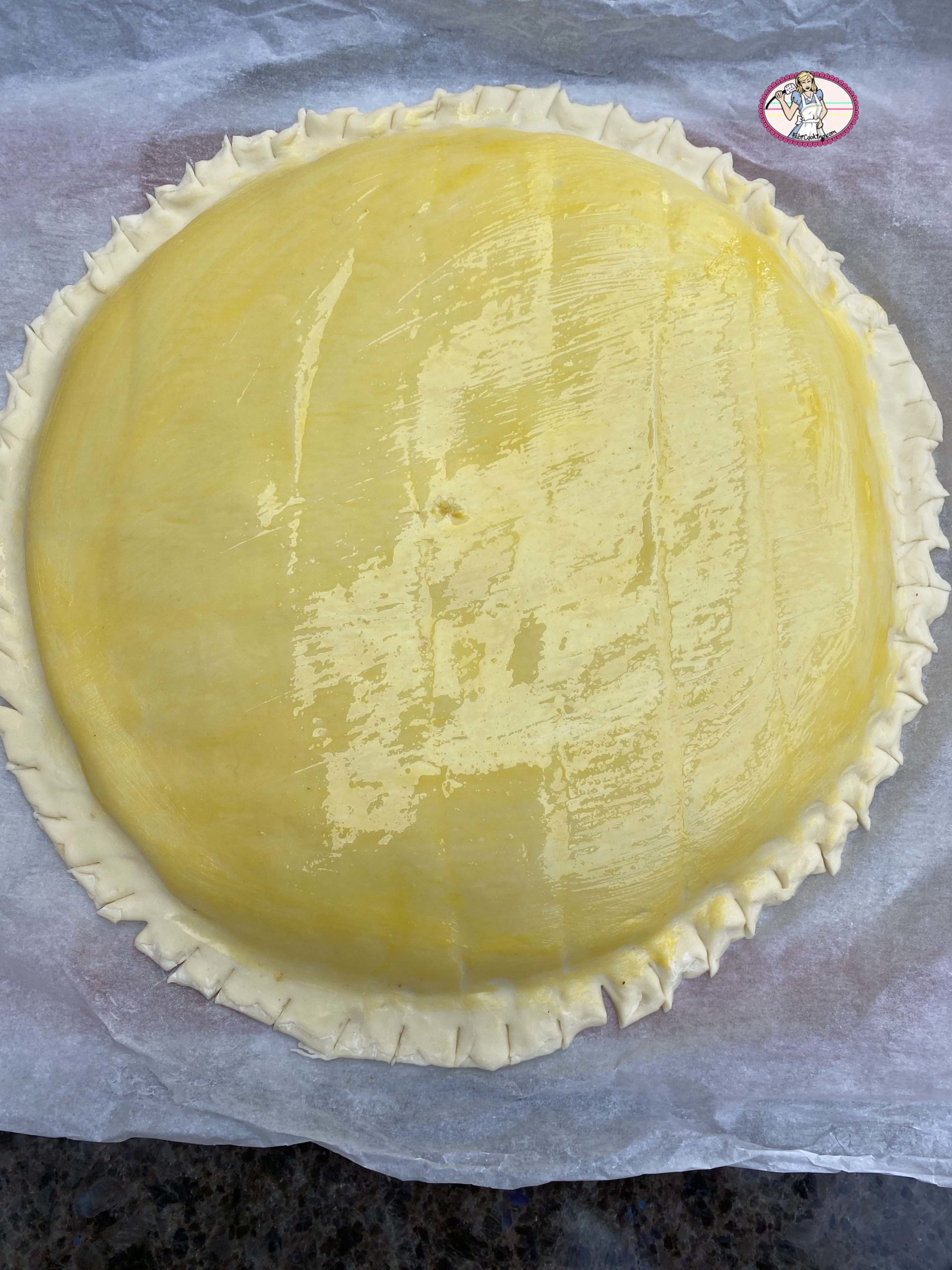 10. Préparer la dorure avec le jaune d’oeuf et le lait et en badigeonner le dessus de la tarte en omettant les bords. Placer au frais.