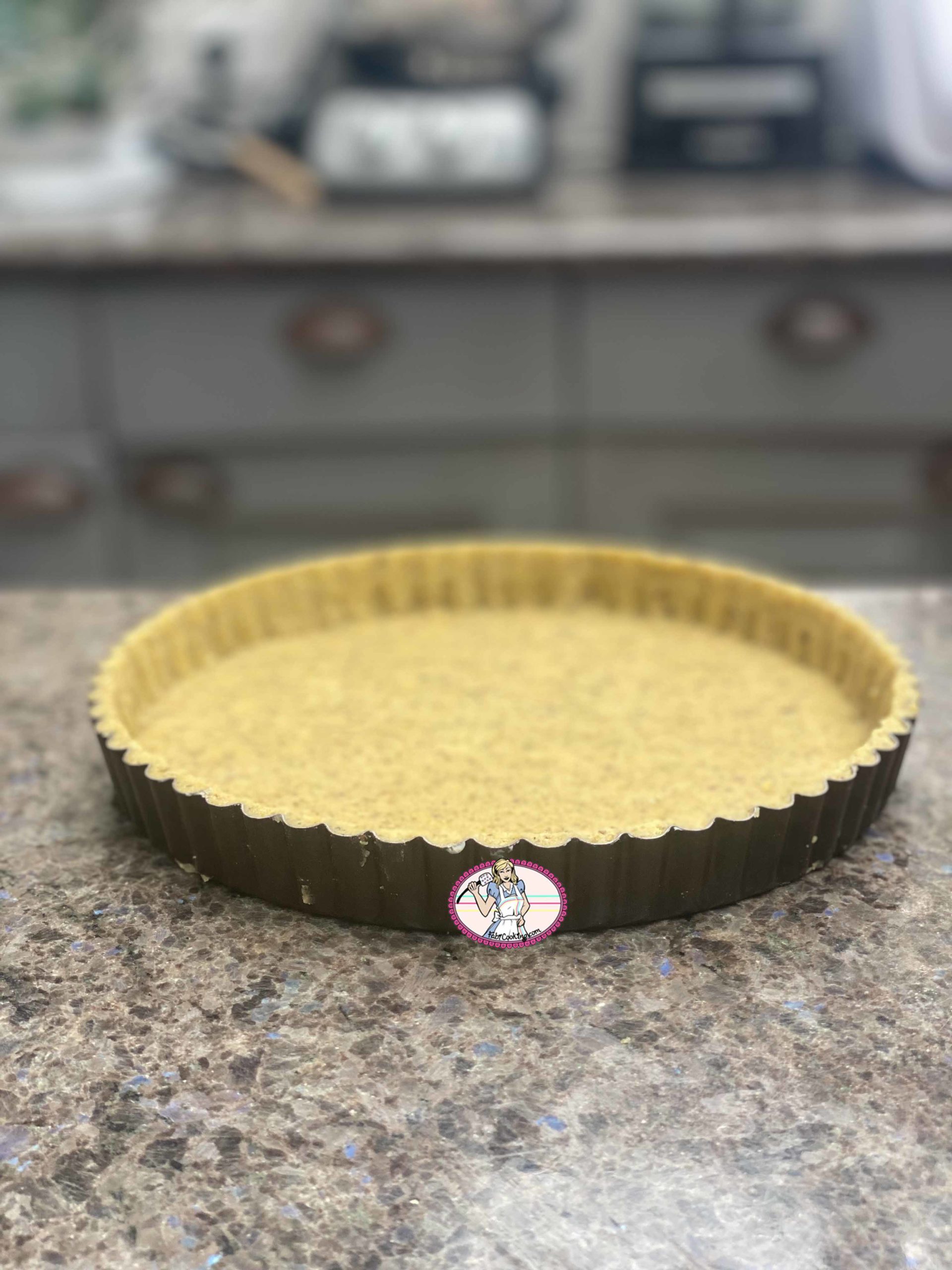 9. Au sortir du four, saupoudrer à travers une passoire fine, un peu de Mycrio pour imperméabiliser le fond de tarte ou à défaut, faire fondre 20 g de chocolat blanc et badigeonner le fond a l’aide d’un pinceau.