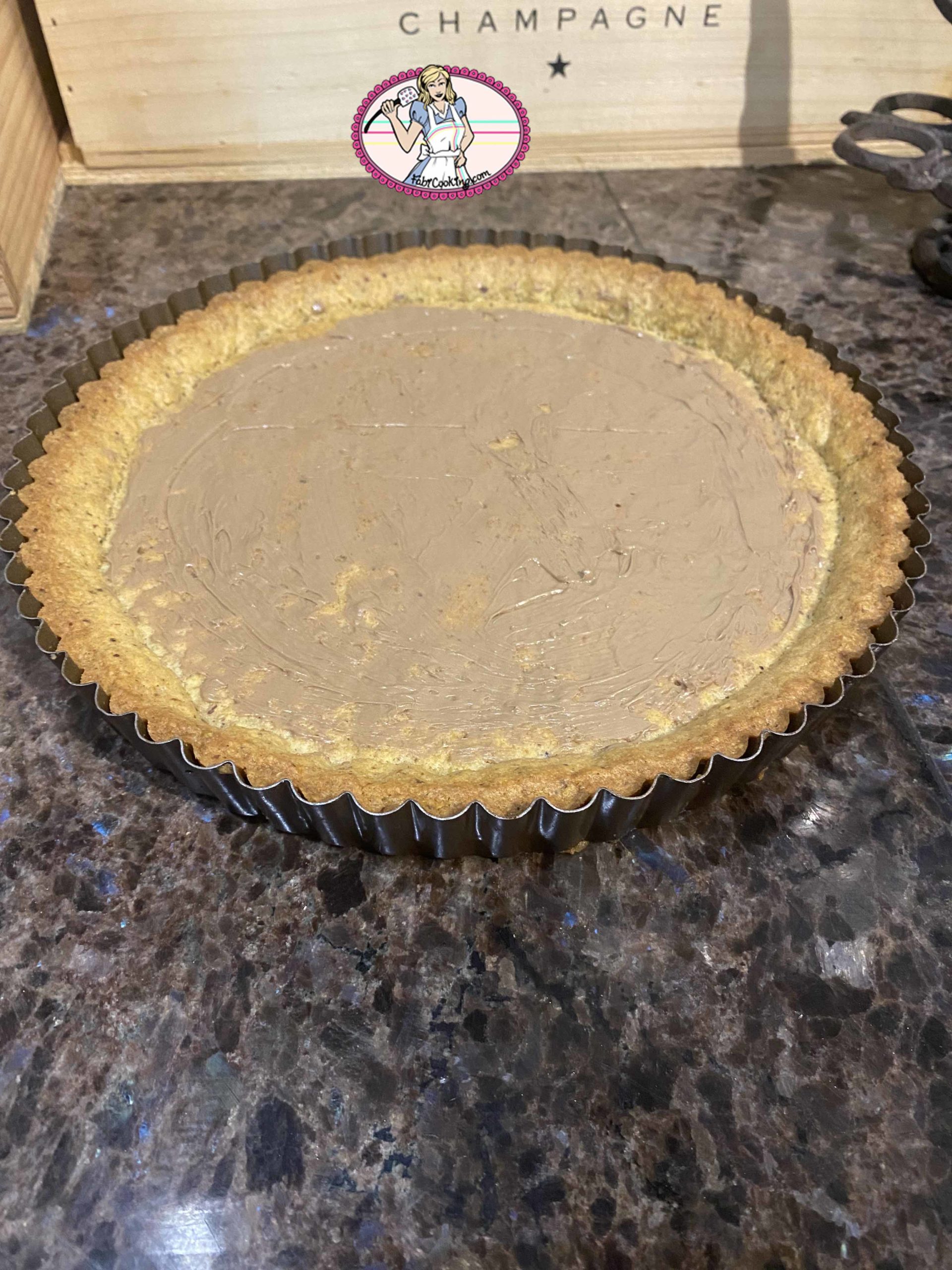 10. Quand le fond de tarte est refroidi, passer la pâte de pistache ou le praliné pistache 20 secondes au micro ondes si nécessaire et en badigeonner le fond de tarte.