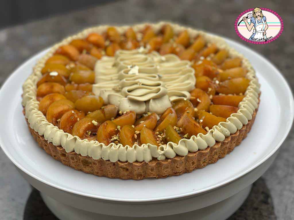 Sur le fond de pâte, une pâte de pistache ou un praliné pistache en couche fine, puis une compotée de mirabelles sur laquelle viendront se poser les mirabelles telles quelles. Une jolie ganache chocolat blanc- pistache…..pour couronner le tout, avouez, je vous fais saliver!