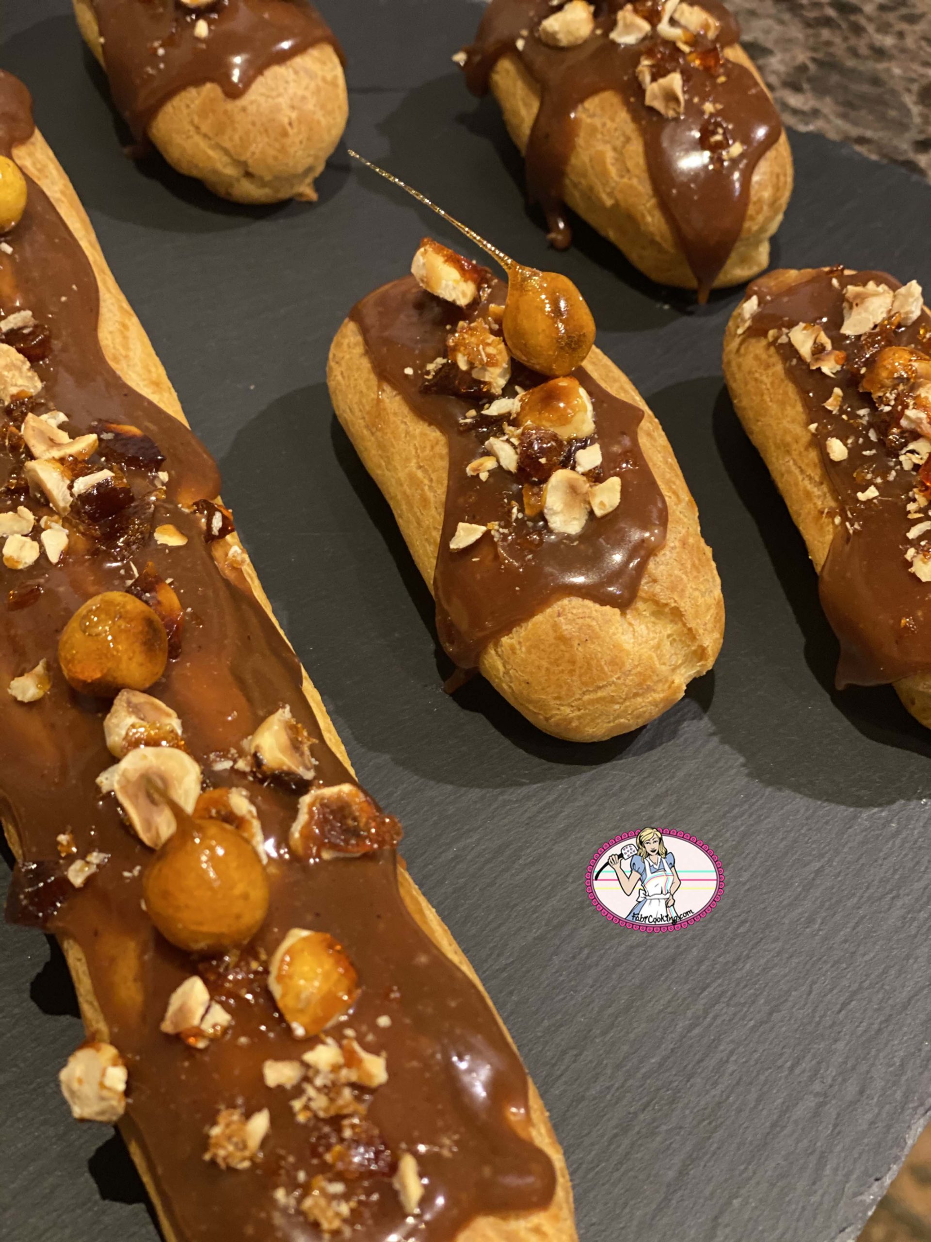 - Garnir une poche pâtissière équipée d’une douille lisse de 8 avec la crème mousseline. Garnir l’éclair ( il va gonfler et sera suffisamment garnir quand un peu de crème ressortira d’un des trous percés.