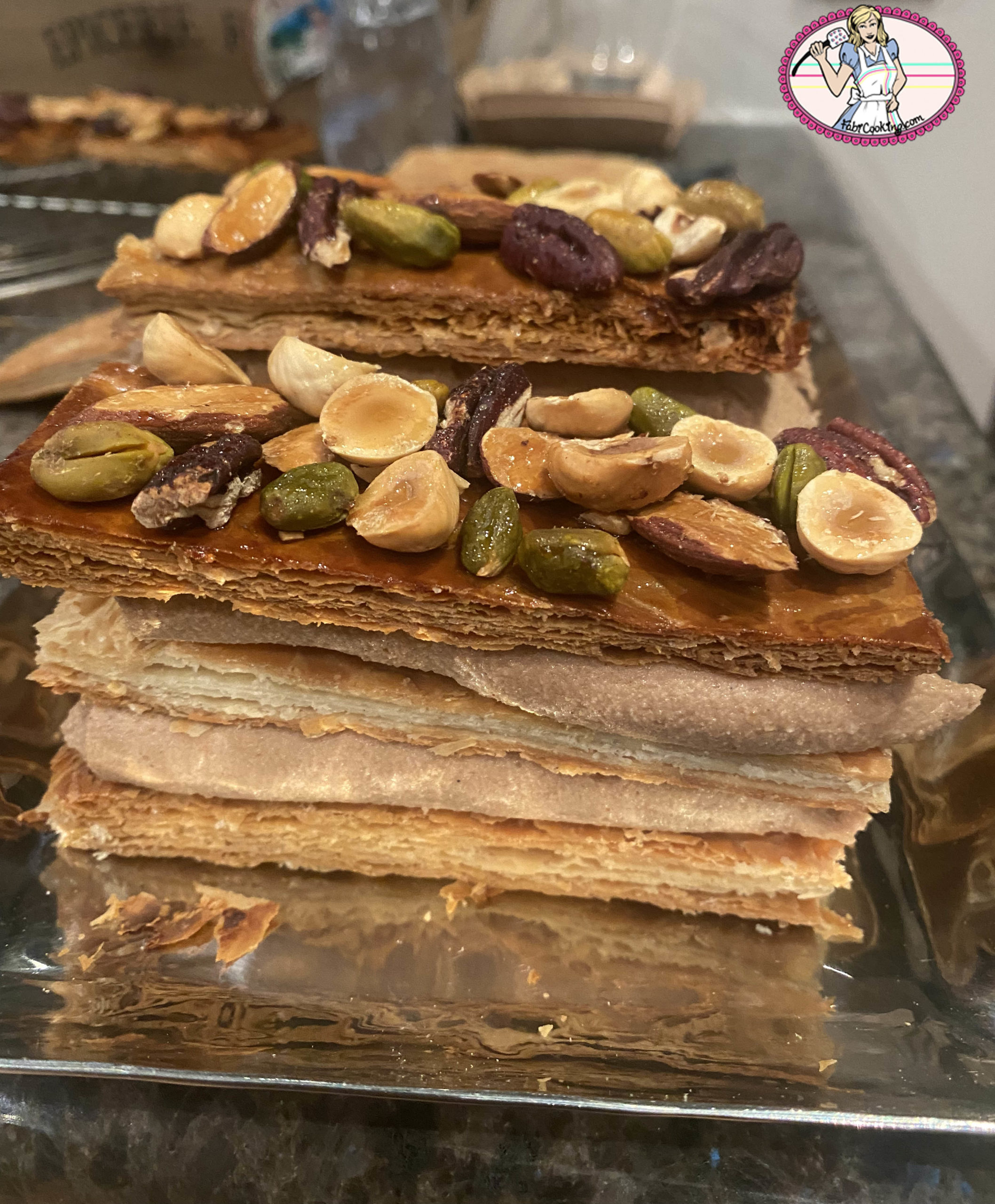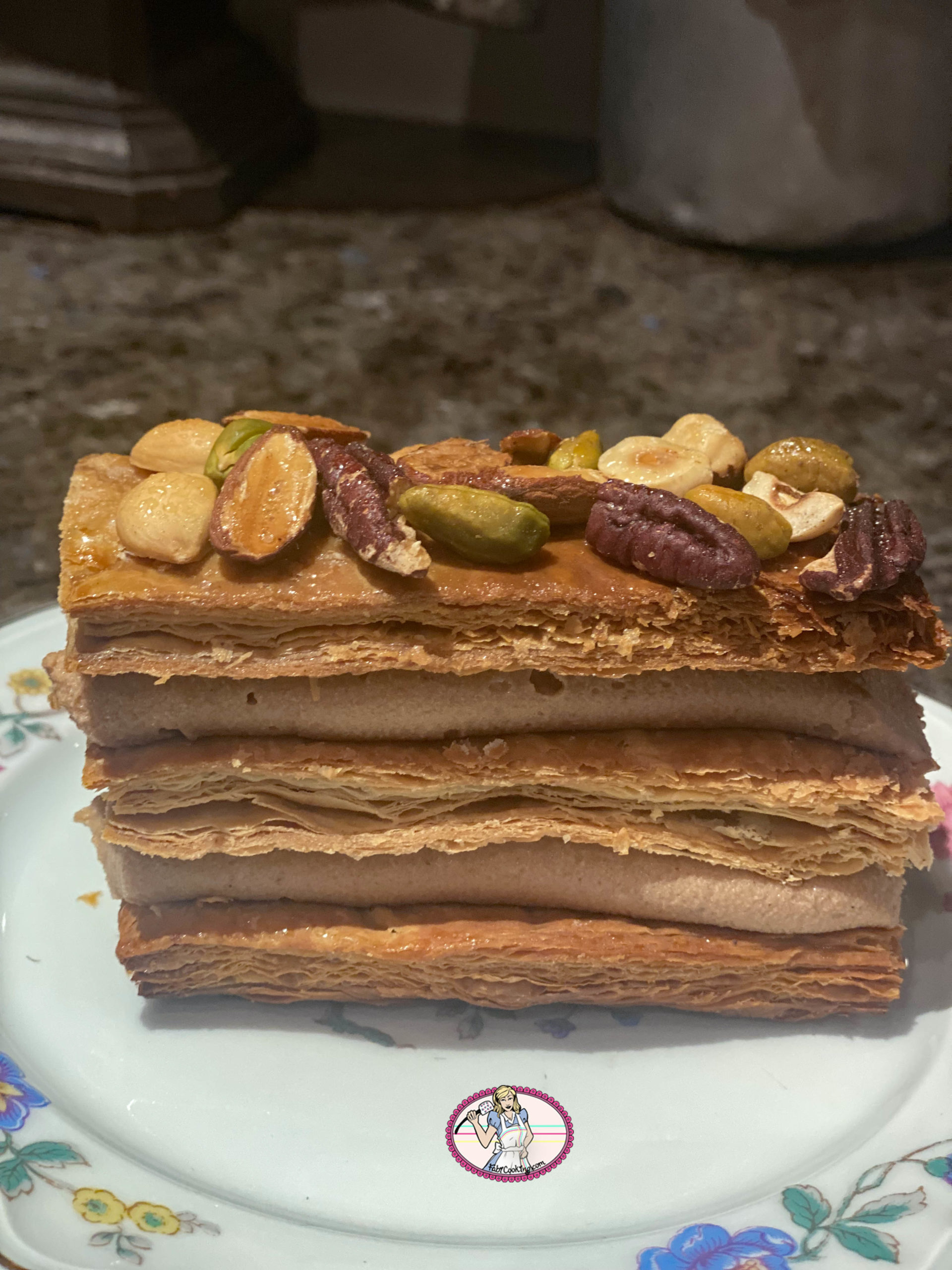 En vacances dans cette belle ville de Nice, vous comprendrez que je n’ai pas accès à Ma cuisine. Celle-ci est très bien garnie mais ….j’ai mes habitudes alors je poste aujourd’hui cette recette de mille-feuilles aux fruits secs et praliné qui ne demande pas un matériel trop sophistiqué et dont nous nous sommes régalés. Comme quoi…..