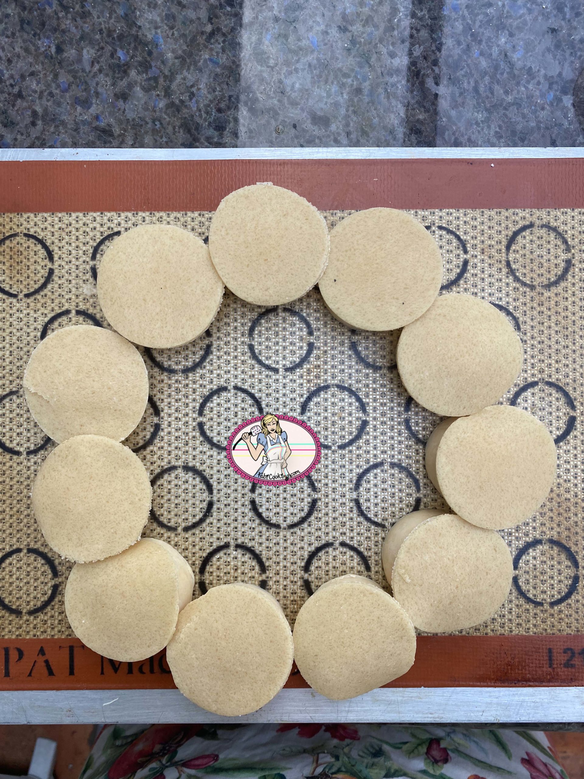5. Découper le nombre de parts requises à l’aide d’un emporte pièce de diamètre +/- 4 cm ( le craquelin doit bien recouvrir le dessus du chou). Réserver au réfrigérateur.