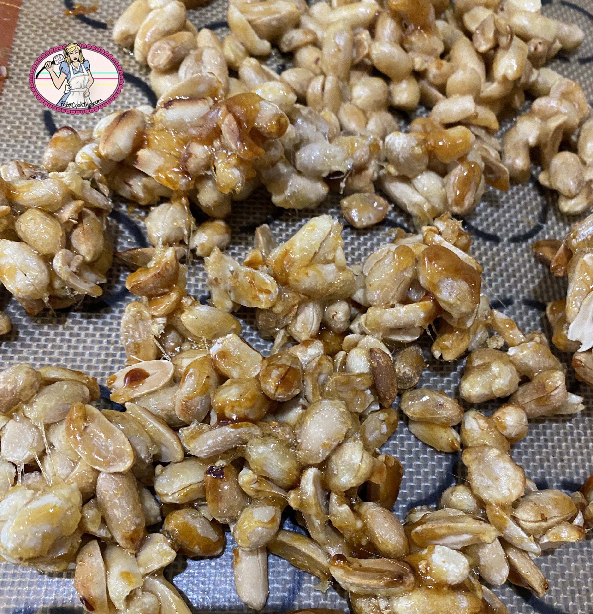 2. Préparer le caramel avec le sucre et l’eau. Si vous avez une casserole en cuivre, c’est le meilleur outil! N’hésitez pas à en acheter en brocante, on en trouve à très petits prix. Quand le caramel prend une jolie couleur ambrée, jetez y les cacahuètes. Bien mélanger pour les enrober et débarrasser sur un tapis de silicone. Laisser refroidir.