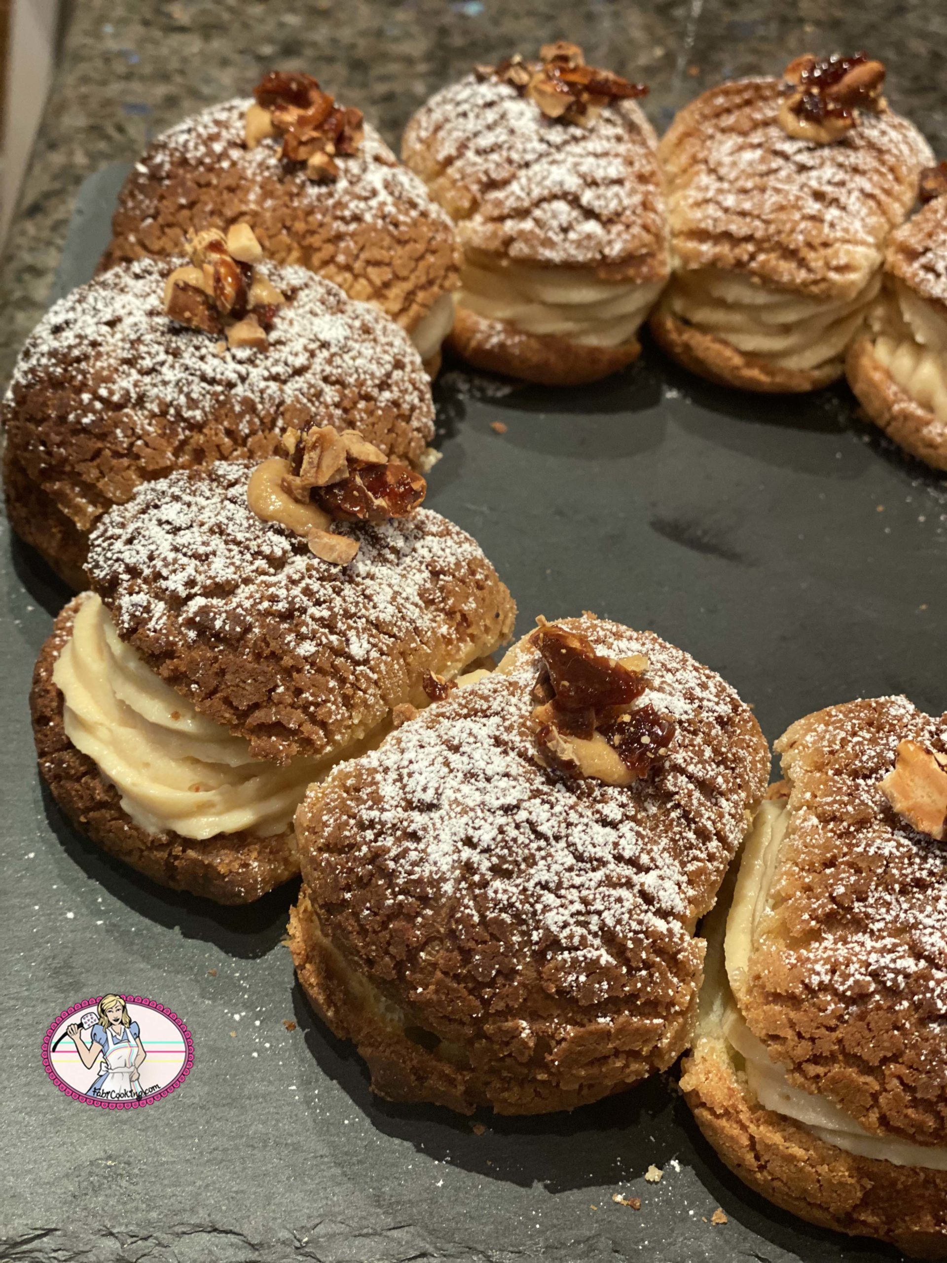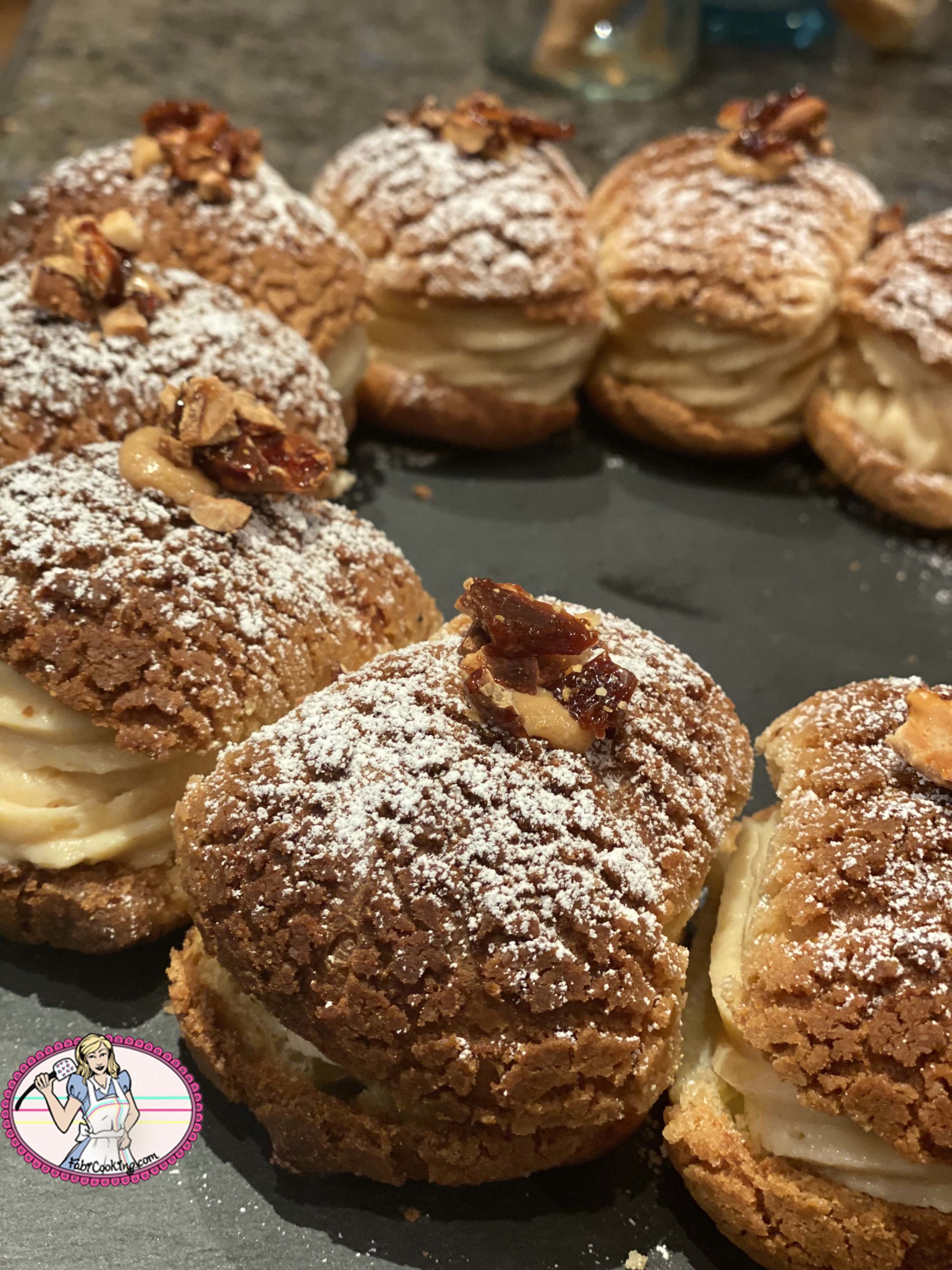 1. Le jour même, pocher la pâte à choux et placer les ronds de craquelin sur le dessus. Cuire la pâte à choux à four préchauffé à 170° pendant 30 à 35 mn. Ne pas ouvrir la porte du four lors de la cuisson sauf très furtivement 5 mn avant la fin pour évacuer la vapeur. Placer sur une grille pour refroidir.