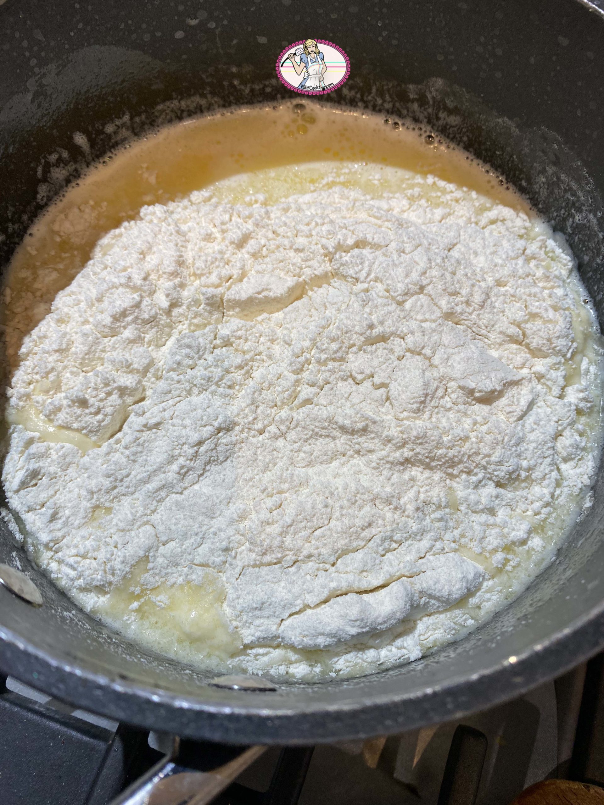 2. Retirer la casserole du feu et ajouter en une fois la farine tamisée en mélangeant vigoureusement à la spatule en bois pour éviter la formation de grumeaux. Reposer sur le feu.