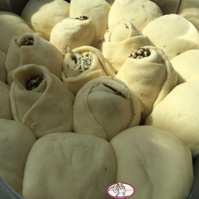 - La boule de pâte simple: étaler la pâte sur une épaisseur de 3 mm, découper avec un emporte pièce de 7 cm; garnir de la préparation fromages/ menthe/ail et terminer avec le zaatar mélangé avec l’ huile d’olive . Façonner une petite bourse en ramenant la pâte vers le centre et en la pinçant. Rouler dans la paume sur le plan de travail légèrement fariné, partie pincée vers le bas.
