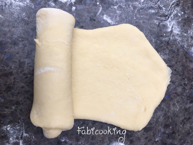 8. Etaler la pâte en bande rectangulaire. Comme la pâte est élastique, elle a tendance à se déformer mais un simple étirement avec les doigts sur les côtés sera suffisant pour lui donner une plus jolie forme, ne vous inquiétez pas!