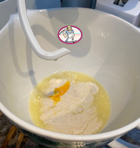 - Dans la cuve du robot équipé de la feuille, verser le lait chaud, l’eau tiède, l’huile et la levure. Ajouter les deux cuillers à soupe de sucre, les deux blancs et le jaune. Si vous faites la pâte à la main, utiliser un fouet pour bien mélanger tous ces ingrédients.