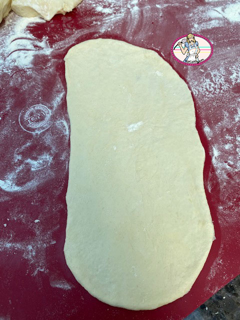 - Etaler chaque boule de pâte au rouleau pour former un rectangle.