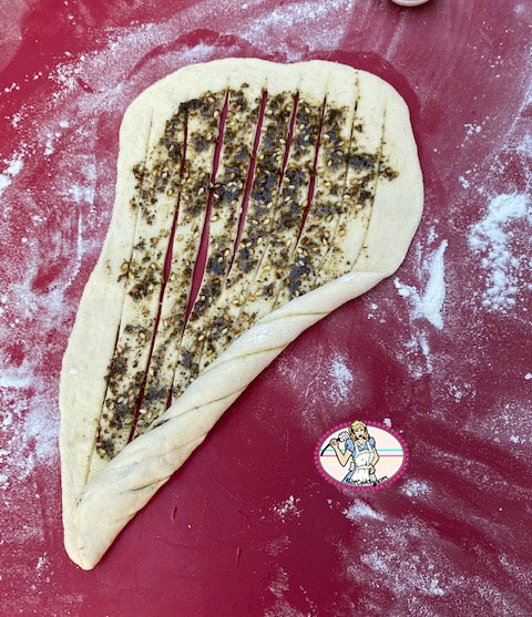 - Commencer à rouler la pâte en oblique jusqu’au bout. Attraper les deux extrémités et les coller de manière a obtenir un cercle.