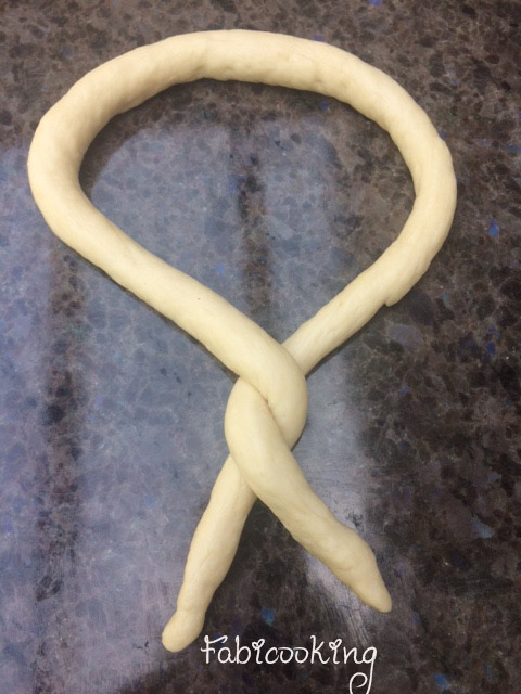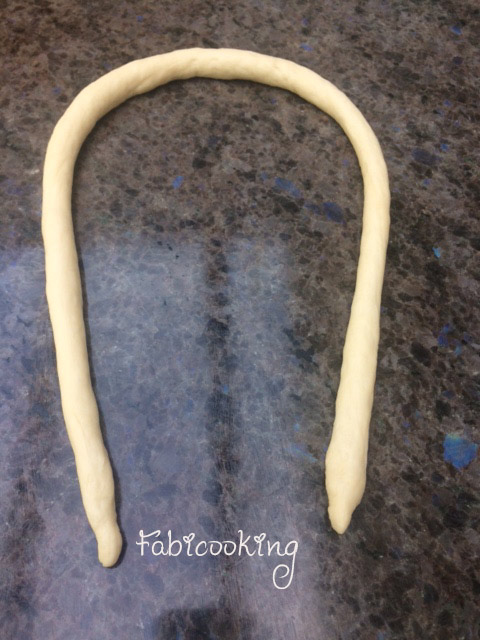 - Attraper les deux extrémités de chaque boudin, soulever le tout, étirer légèrement et former un U à l’envers.