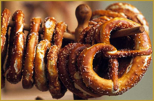 Je ne vous ai pas encore parlé des Bretzels: » Un ou une Bretzel ( pretzel) est une pâtisserie salée traditionnelle de la cuisine alsacienne et de la cuisine allemande, à base de pâte pochée dans une solution de bicarbonate de soude, en forme de nœud ou de bras entrelacés, et recouvert d’éclats de gros sel. » Wikipédia