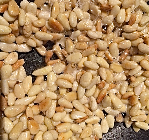 - Dans une poêle avec 1 cuiller à soupe d’huile d’olive, faire revenir à feu doux les pignons de pin en évitant qu’ils ne noircissent. Laisser s’égoutter sur un essuie-tout et procéder de même avec les amandes effilées. Ajouter à la viande la moitié des pignons de pin.