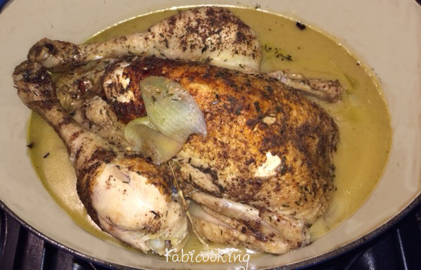 - Préparer un bouillon avec 500 ml d’eau chaude et 1 bouillon cube de poulet et faire cuire le poulet à couvert pendant 1h à 1h 30 ( selon le poids du poulet) en ajoutant sel, poivre doux, thym et feuille de laurier, poireau et carotte…..ces derniers sont juste pour le goût du bouillon.