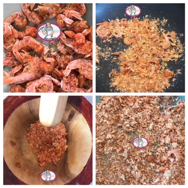 - Dans une poêle, faire revenir sans matières grasses, les crevettes séchées ( épiceries asiatiques genre Tang) puis les écraser au mortier assez finement.
