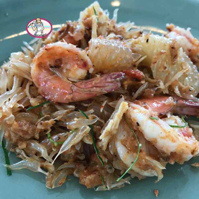 Cette Salade de Pomelo aux crevettes à la thaïlandaise ou Yam Sohm Oh ( sohm oh, c’est le pomelo) se retrouve dans ces deux pays et c’est pour cela que je choisis de vous en parler aujourd’hui d’autant que je la prépare de temps en temps- le plus dur étant de préparer le pomelo- . Le gros avantage en Thaïlande, c’est que la chair de pomelo se vend un peu partout nettoyée et débarrassée de sa membrane blanche amère, c’est un vrai bonheur!