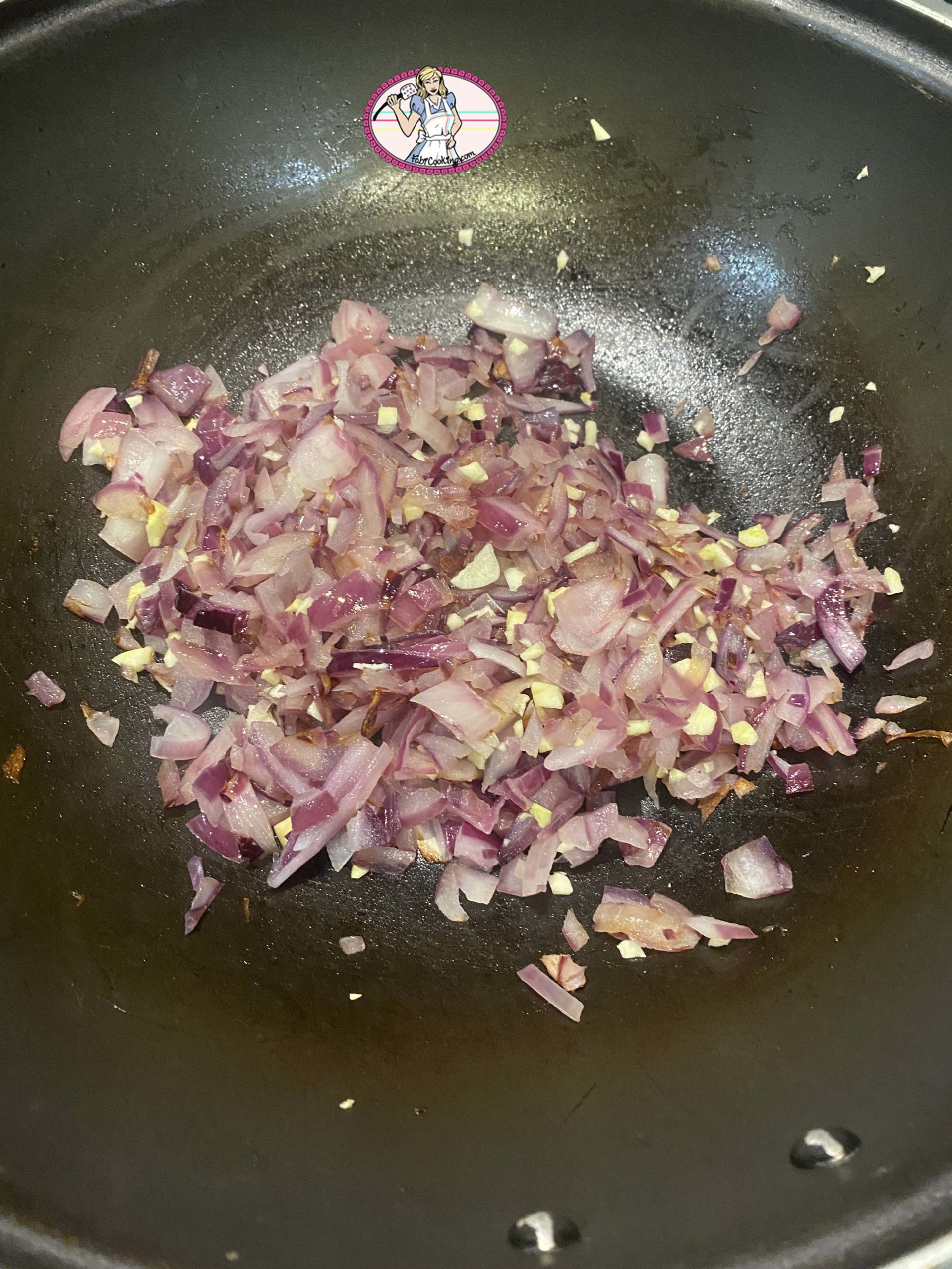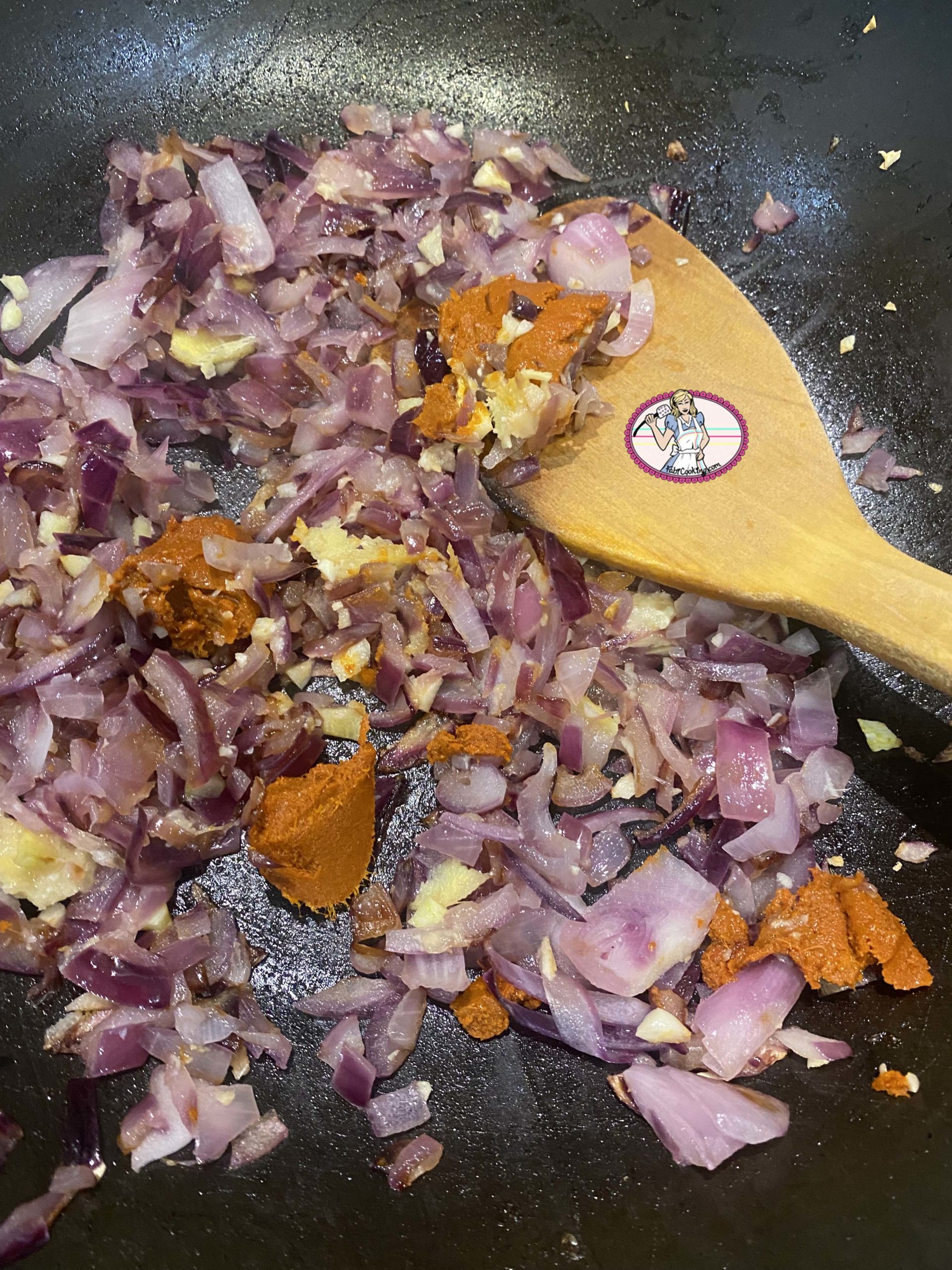 - Dans un wok, faire revenir l’oignon puis quand il devient translucide, les gousses d’ail écrasées.