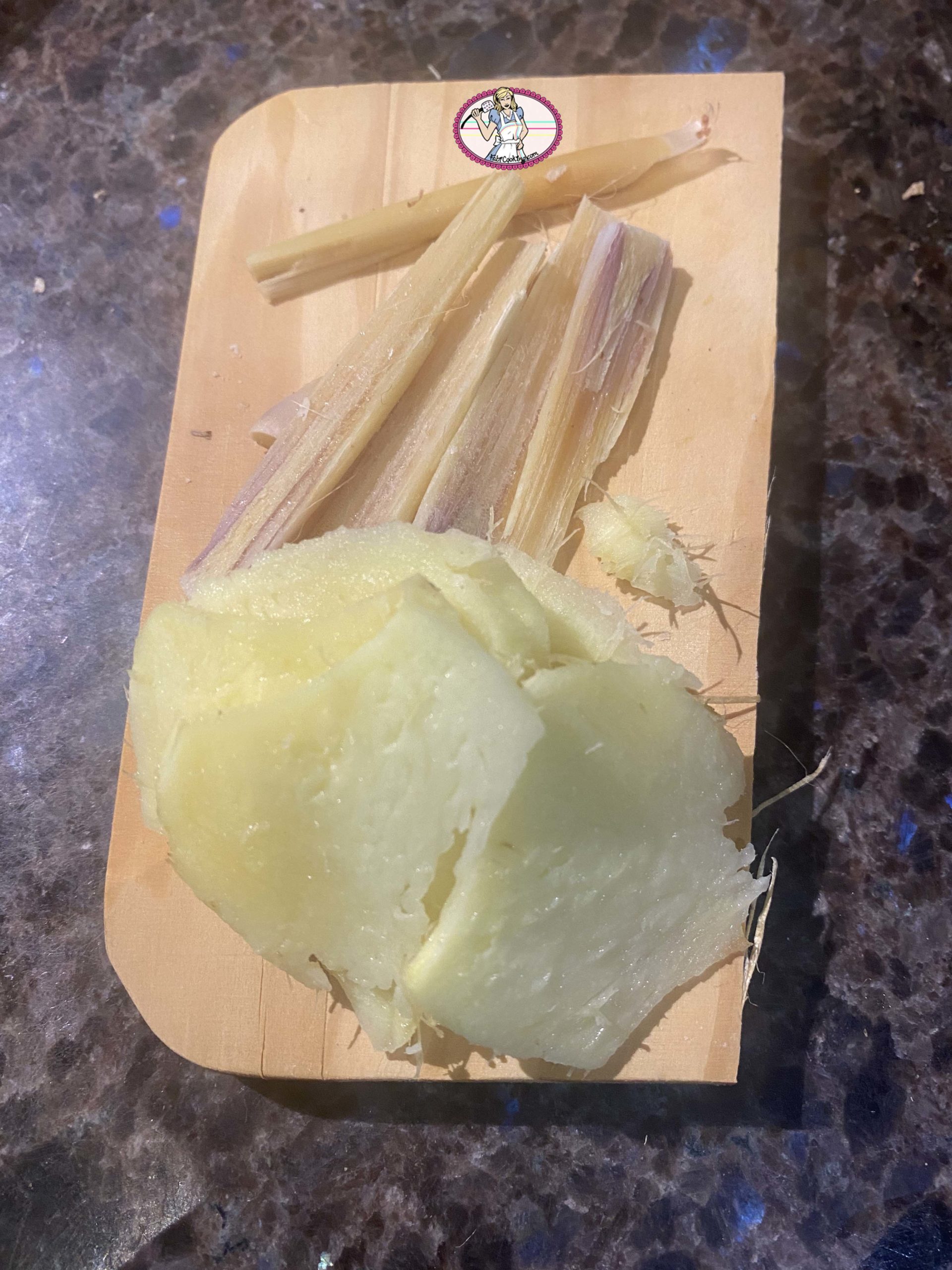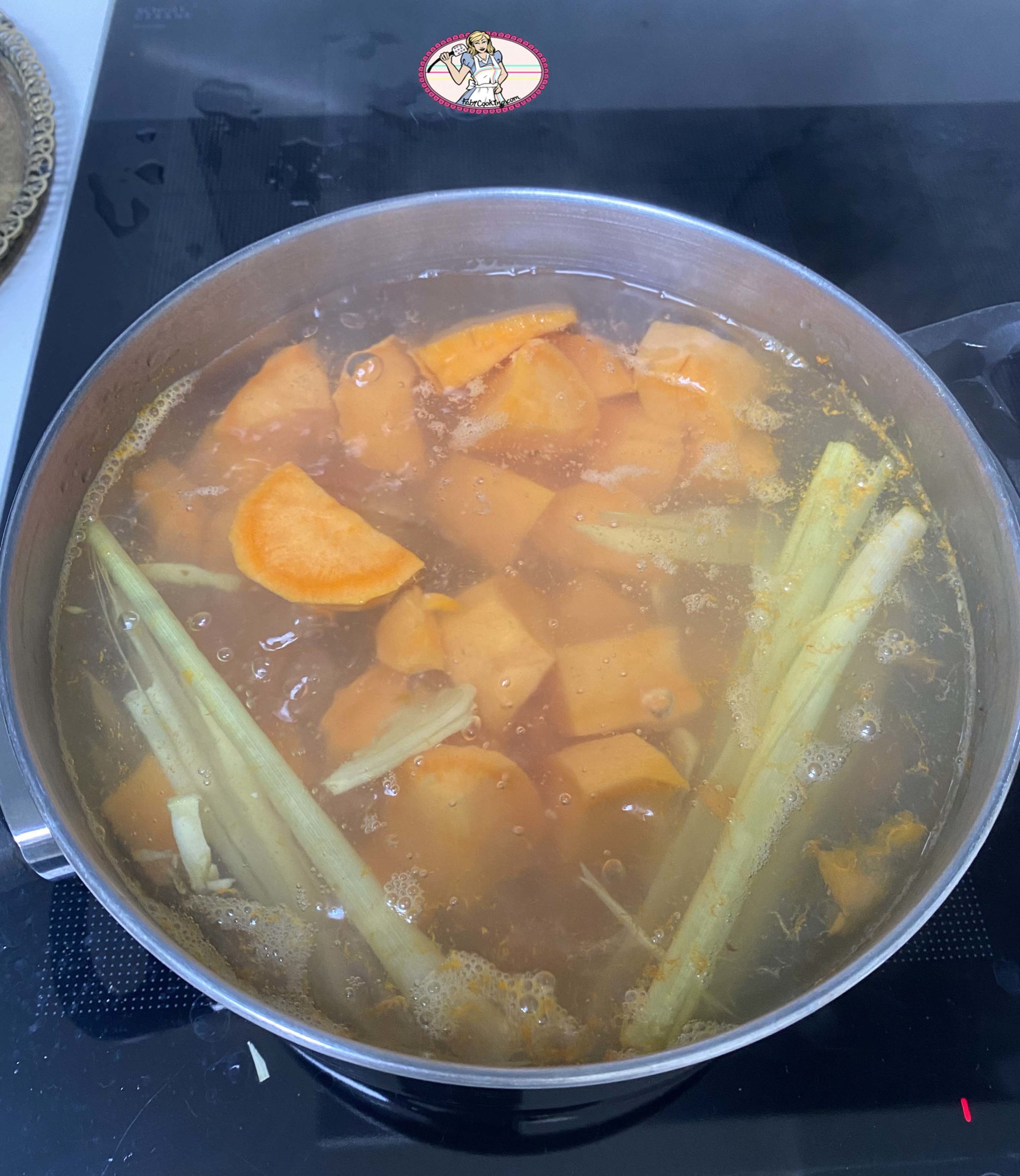 2. Dans une casserole, verser 1 litre d’eau chaude et laisser infuser le gingembre et la citronnelle pendant 15 bonnes minutes avant d’ajouter la patate douce coupée en rondelles de 2 cm d’épaisseur.