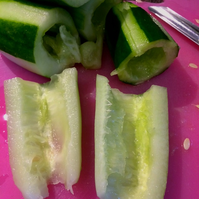 - Evider le concombre avec un vide- pomme, le détailler en morceaux et le laisser dégorger 30 minutes dans une passoire en le salant légèrement. Si vous êtes pressée, épongez- le sur un papier absorbant.