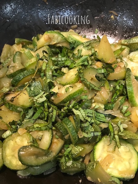 - Ajoutez les dans le wok avec le brin de thym, le poivre et le bouillon de légumes en poudre émietté. Faire cuire à feu moyen jusqu’ à ce que les courgettes deviennent translucides. Je n’ai pas eu besoin de rajouter du sel.