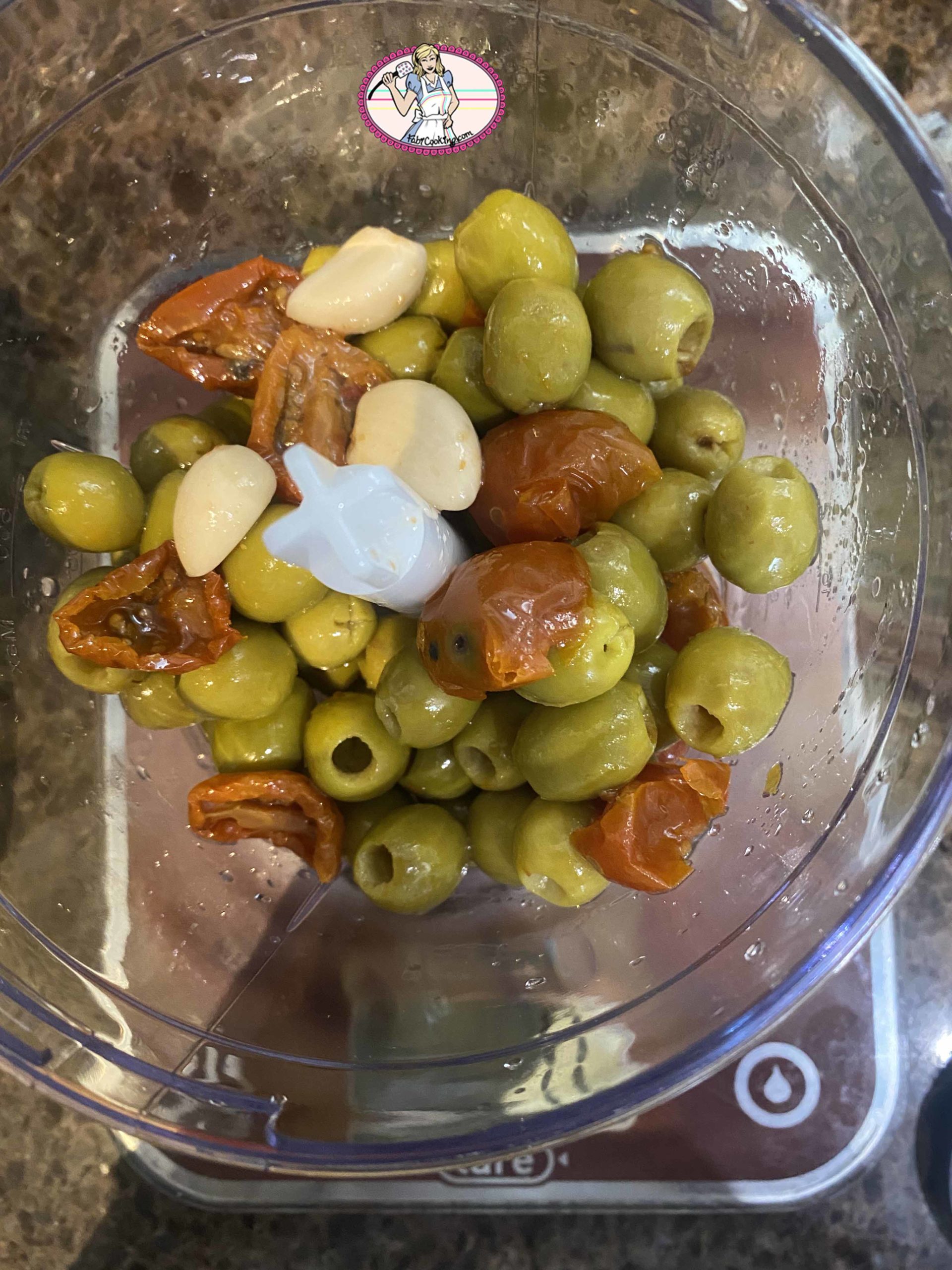 - On place les olives vertes, l’ail et les tomates séchées dans le petit robot. On ne rajoute surtout pas de sel!