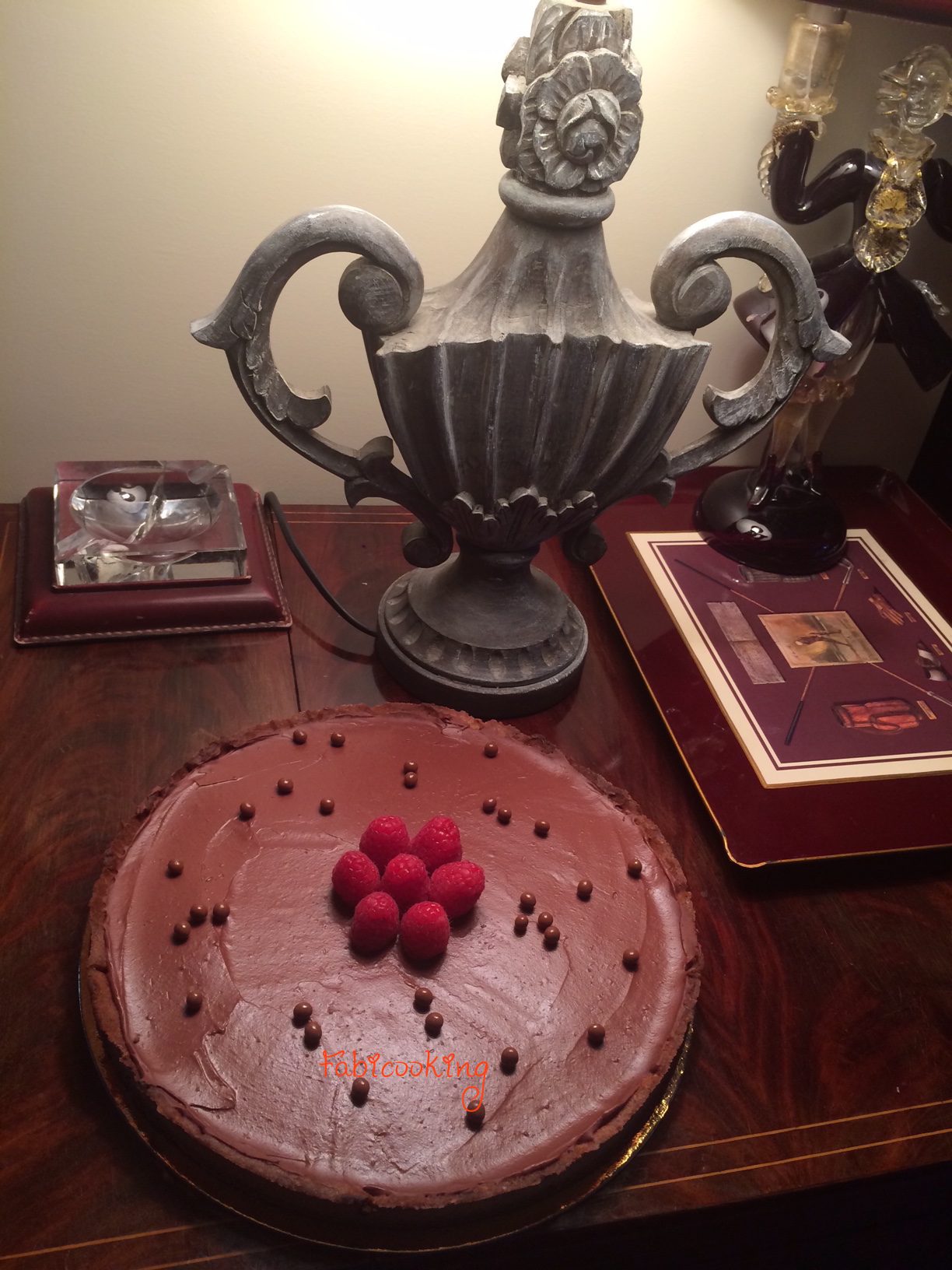 8. Laisser refroidir à température ambiante pour que le chocolat commence à  cristalliser. Réserver au réfrigérateur  si vous préparez cette ganache pour le lendemain . Sinon, utiliser aussitôt sur votre fond de tarte en lissant la surface à l’aide d’une spatule – j’étais pressée et ça se voit au résultat , pardon ! –  et placer au réfrigérateur deux heures. Sortir la tarte au chocolat framboise  une bonne heure avant dégustation. Garnir  de quelques framboises fraîches: voici, aussi simple que cela, votre tarte chocolat framboise !