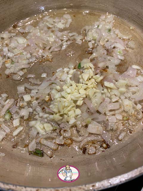 - Couper l’échalote en petits dés, dégermer l’ail, l’écraser avec le plat de la lame d’un couteau puis détailler en petits morceaux. Placer dans une poêle avec l’huile d’olive, et faire revenir à feu doux.