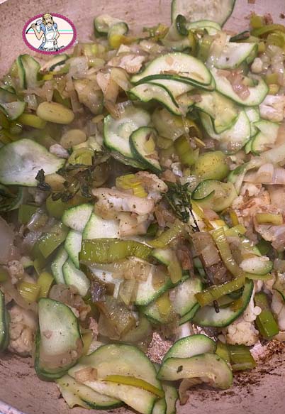 3. Faire revenir et suer le poireau quelques minutes avec l’échalote pendant que vous trancherez finement les courgettes à la mandoline pour les ajouter au mélange précédent. Saler, poivrer et ajouter la branche de thym.