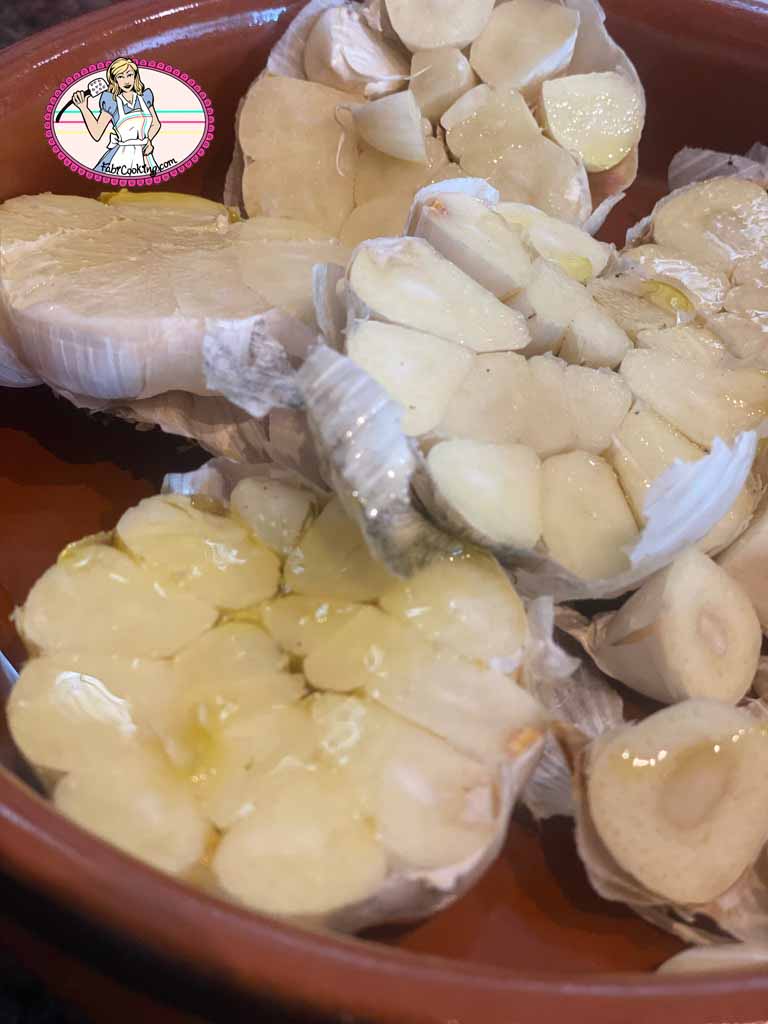 3. Couper les têtes d’ail en deux dans la largeur et les placer à côté des poivrons, si vous optez pour une cuisson au four, avec un filet d’huile d’olive dessus. Cuisson 35 à 40 mn à 170°. Ils doivent être confits. N’oubliez pas que le temps de cuisson dépend de votre four. Le mien est très grand et la cuisson prend plus de temps que dans un four de taille normale.