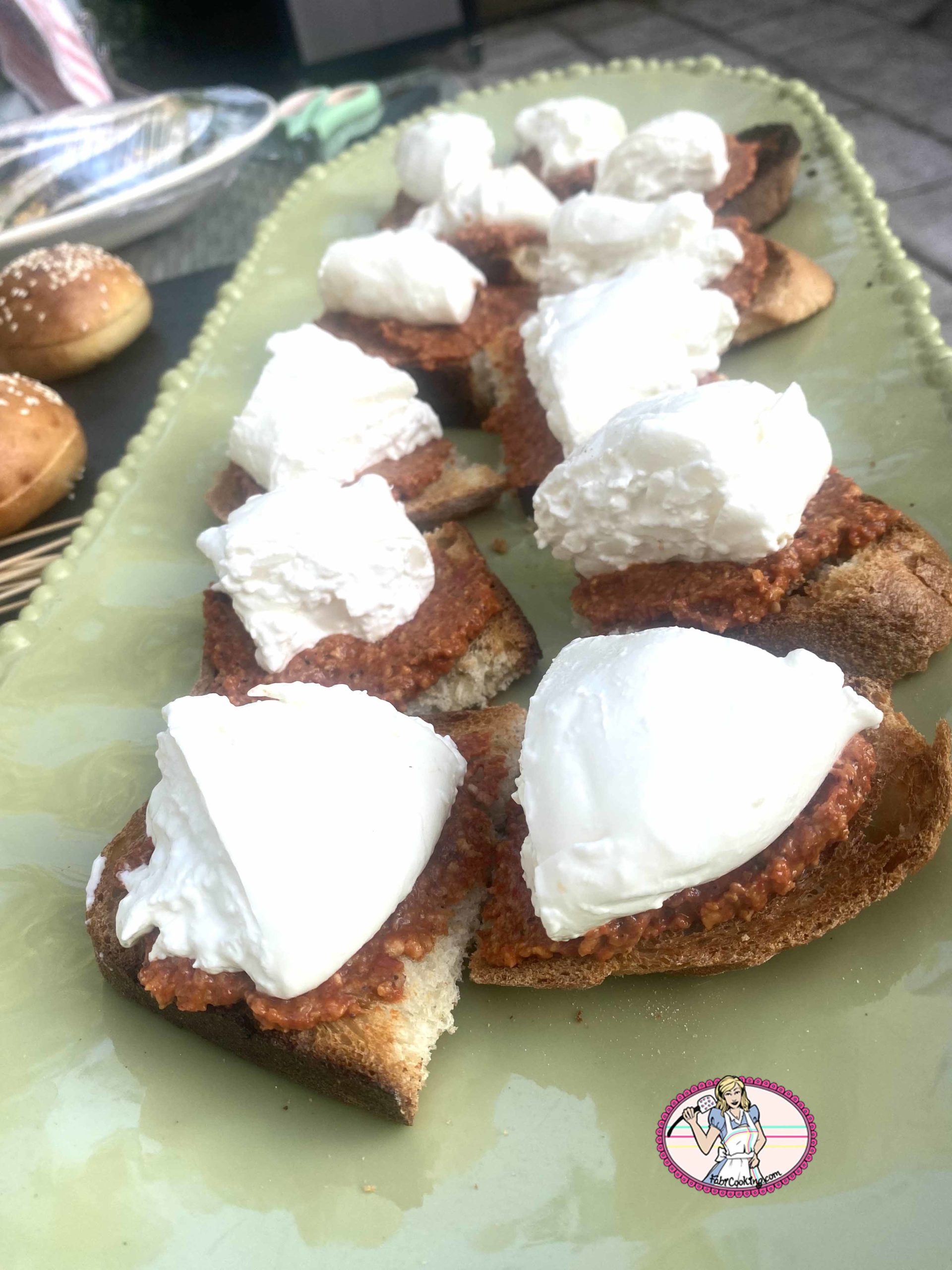 6. Couper la burrata – les miennes étaient magnifiques, hyper bonnes et …grosses- et en placer un morceau sur chaque morceau de pain. Dégustez!