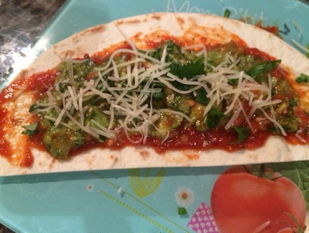 2. Etaler sur le fond de la tortilla une cuiller à soupe de salsa en évitant les bords sur un bon centimètre ( ma photo est carrément…nulle )IMG_5963.